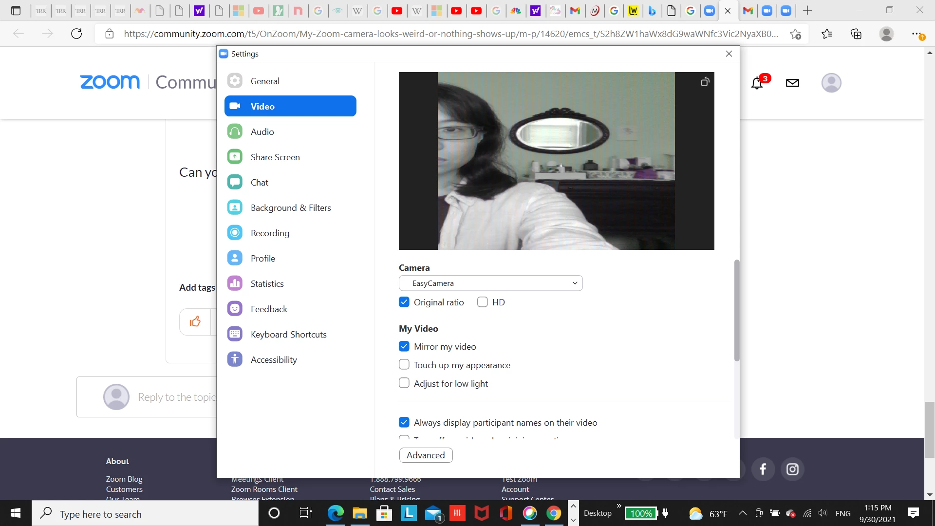 Since few months ago whenever I try to join zoom meeting invitations or interview invitations I don't see myself on the screen. I click the video on ("Easy Camera"), but most of the times I can't see myself on the screen and the other party can't see me (it's just black with my name). Sometimes I can see myself and the other party can also see myself, but my face looks pudgy and elongated sideways and the proportion is weird. The color of the screen is greenish too (weird), and the focus is not right because even if I sit by placing the laptop right in front of me in the center, on the screen my face is placed in the edge of the screen and I can onlly see half of my face.