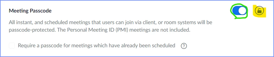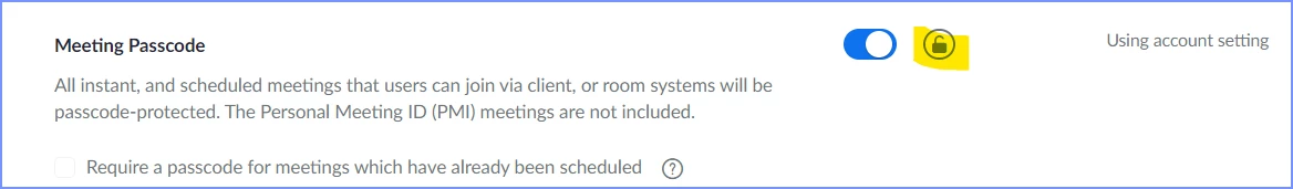 Locate the Meeting Passcode section. Check that the lock icon is UNLOCKED:
