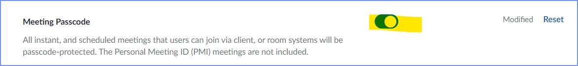 Note that the text seems to imply that if this switch is turned on, Passcodes WILL be required. In fact, the switch is only setting the DEFAULT for the Passcode setting for new meetings. If you really don't want Passcode settings on your meetings (meaning you'll rely on Waiting Rooms and/or Authentication for security), then you can set this switch to OFF: