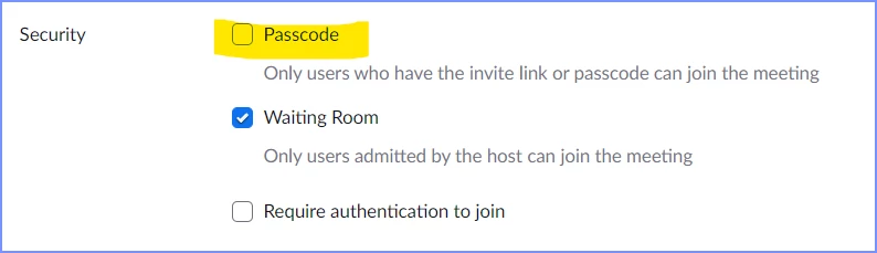 Reminder: You MUST have at least one of these security options set: Passcode, Waiting Room, or Authentication: