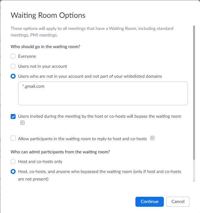 I’d like to be able to schedule meetings that only allow specific email addresses. I saw the document that covers restricting who can join a meeting to email address domains in Waiting room options