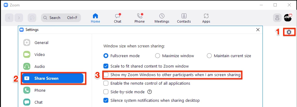 So on settings of the account, I enabled "Show Zoom windows during screen share" but that didn't make any difference.