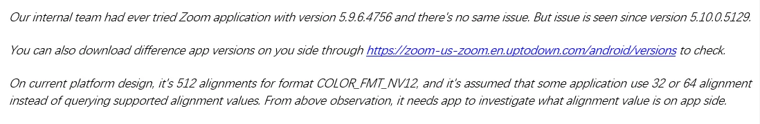 以上問題目前定位到Zoom在解析frame時是使用64 alignment YUV 格式, 但高通mimas平台傳送frame時是使用512 alignment YUV格式,格式不一致導致畫面顯示異常。