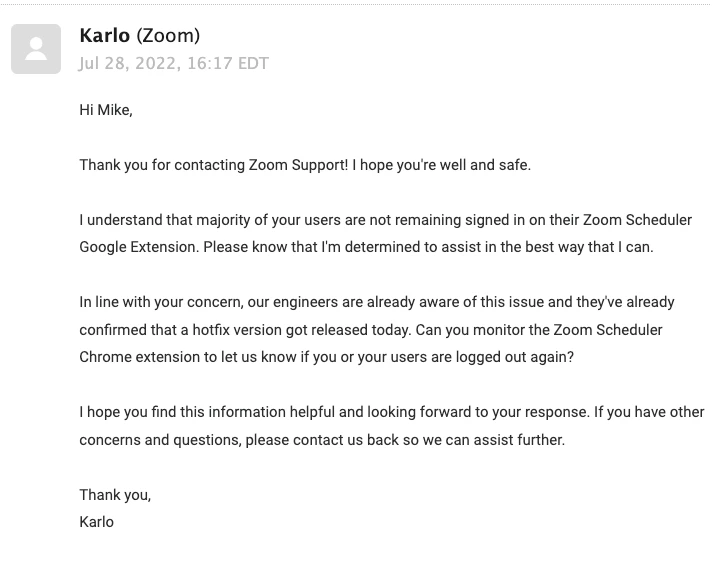 I received an update from Zoom support.