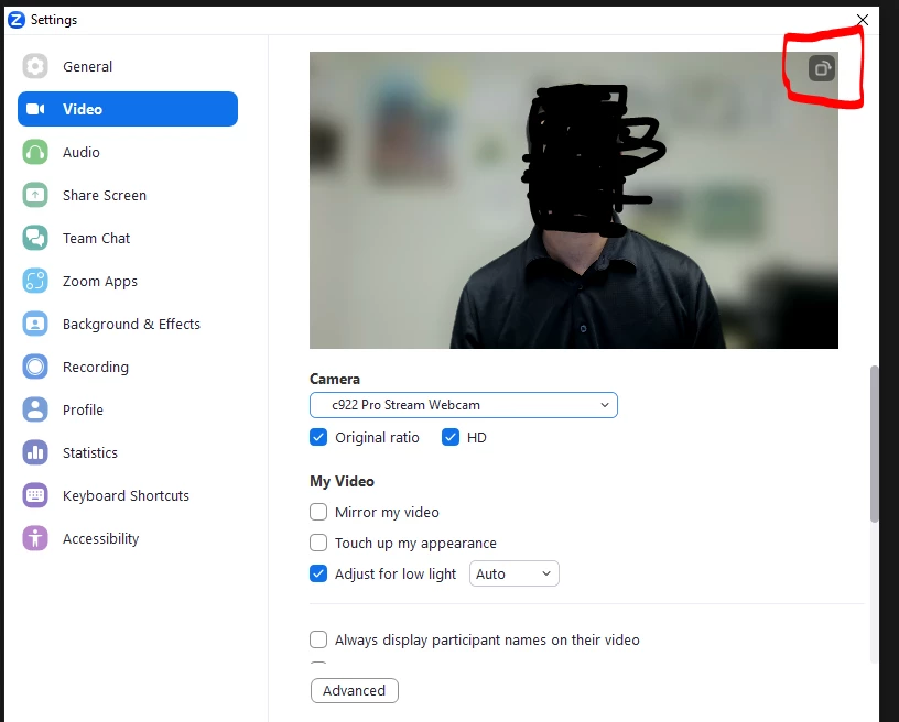 When you're in a meeting, click the Video Settings option under the button to start and stop your video.