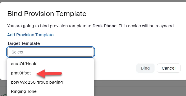 Goto admin->phone system management->phones & devices-> select the desk phone(s) and bind whatever template you want to use.
