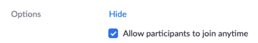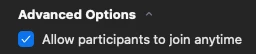 > If done using a Zoom Client (Desktop or Mobile App) , under the "Advanced Options" make sure the "Allow participants to join anytime" is selected