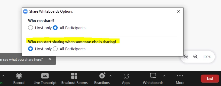 Share Whiteboard Options - what does "Who can start sharing when someone else is sharing?" mean
