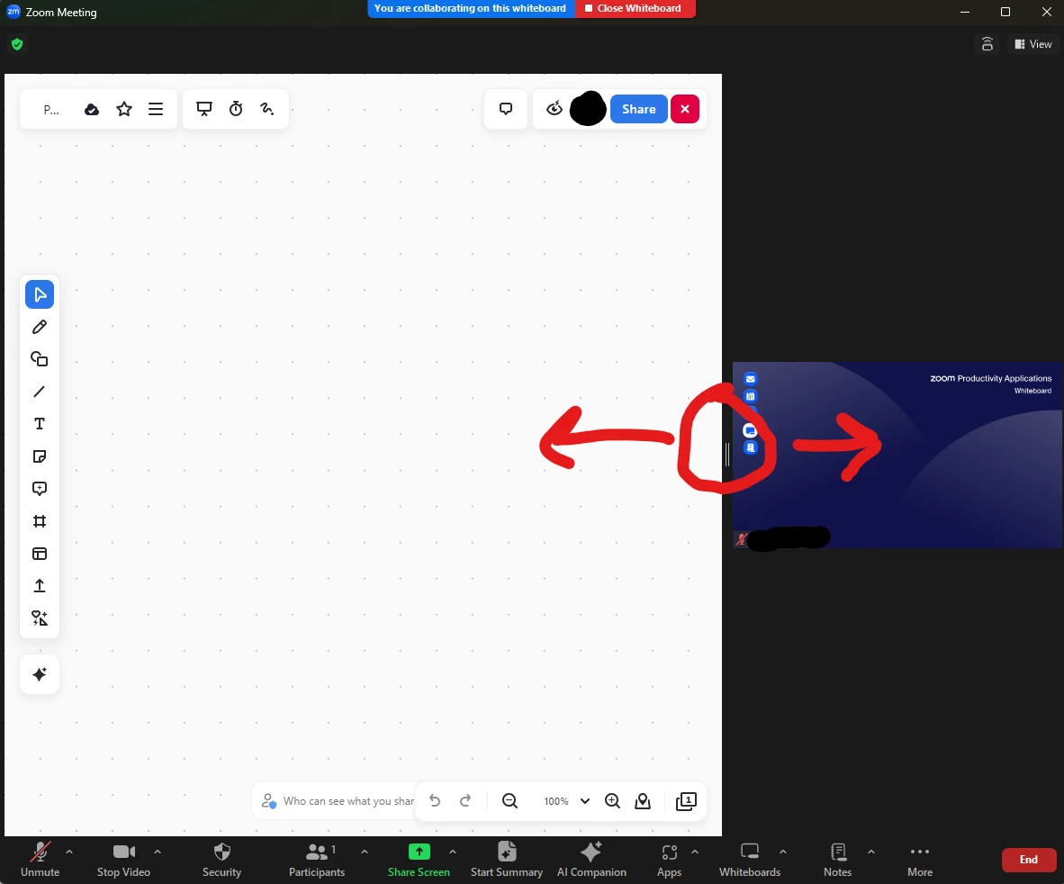 Is there a way to reduce the size of the whiteboard in a zoom meeting? Currently, it takes up most of the screen and the images of participants are very small. I need to see the participants faces more clearly while posting information on the white board.