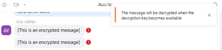 The way I used to fix this was to delete and re-create the affected user's account. Which works like a charm, but this means they lose all their chats so many people aren't too happy with that solution. Zoom Support once provided me with a cleaner.exe file which I can run on someone's computer and then re-install the latest version of Zoom. This works for the most part, but sometimes we do this on someone's computer, and then a week later, the same encryption issue starts happening again.