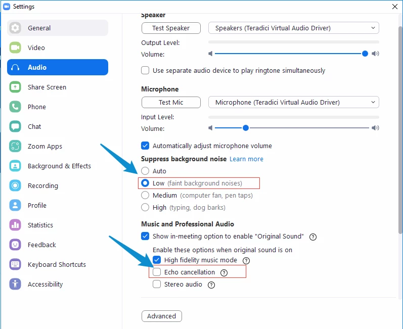 My drum teacher asks me to eliminate echo suppression. How can I do it on my end?