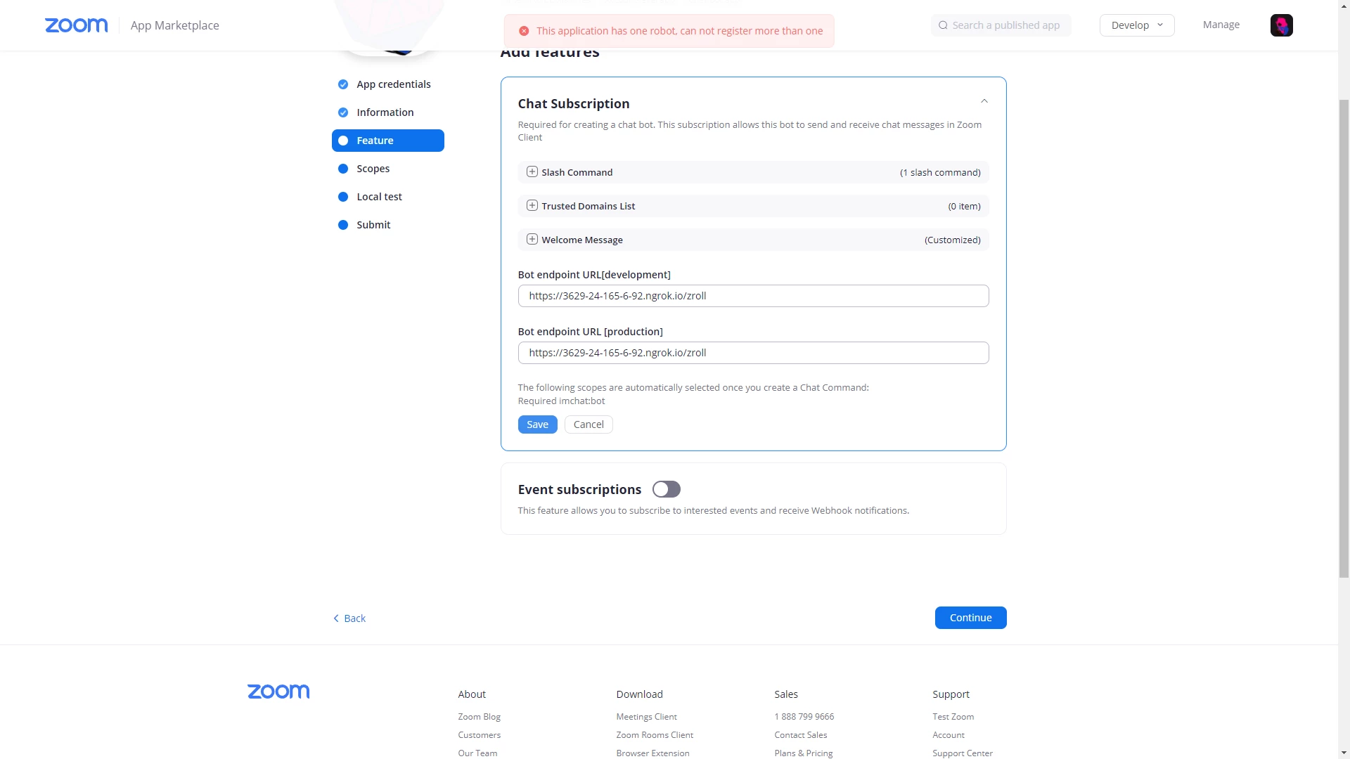 I am building my first Zoom chatbot using a free Zoom account, and I am attempting to do so following this guide. One of the first issues I notice is that an early step in the guide has me putting the JID and verification token values into the .env file inside my Node.js project root, claiming those values can be found on the Features page of the chatbot, and yet those values don't appear. So the subsequent step of installing the app locally for testing fails. Some sources I've read suggest that the JID and verification token won't appear until after the chat subscription feature is added, which is a step in the guide that comes after the .env and local test step, for some reason. To get the blue save button on the chat subscription feature form to become clickable, I have to include a slash command and the development and production endpoint URLs, which I have done no problem. When I click that save button, I am presented with a pop-up error that reads "This app has one robot, can not register more than one" and saving the feature fails. No further explanation than that error message is offered anywhere that I can find. After a day of googling the error, I have been unable to find a single hit relating to it. Not a single page I have found quotes that error, and nobody else appears to have encountered it and made a post about it. So it seems like a thoroughly undocumented error, and I have no idea what it means or what causes it or how to fix it. Does saving a chat subscription feature attempt to register a robot to the app? If so, why is a robot already registered to the app? Is there a bug in my account? Does the fact that I have two other apps on my account (neither of them chatbots) have anything to do with why I might be getting this error? I'm not sure how to diagnose this.