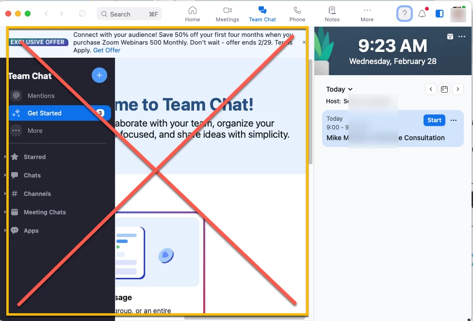 I don't know where else to post this question, apologies if there's a better forum. My account type is Zoom One Pro (5.17, Mac) for client meetings and group trainings only. Been using it for years. I don't recall when they added this rigamarole on the left, but I don't want to look at it. I'm the sole employee at my company, not an enterprise customer. Where do I go to hide it or turn it off? I just want to see the "old school" home screen, which is now shoved over to the right and missing the New Meeting buttons and such.