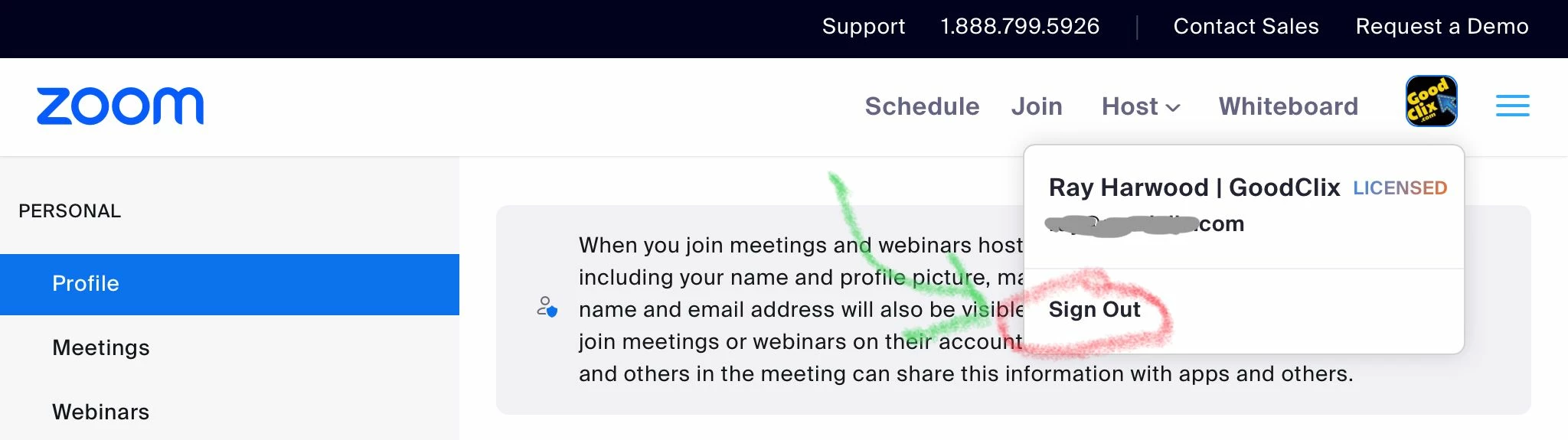 My wife has a paid account, I do not. when joining a meeting I am automatically signed in under my wifes account. Even when I am logged into my account I will still be signed in as her to any meeting I join. Help