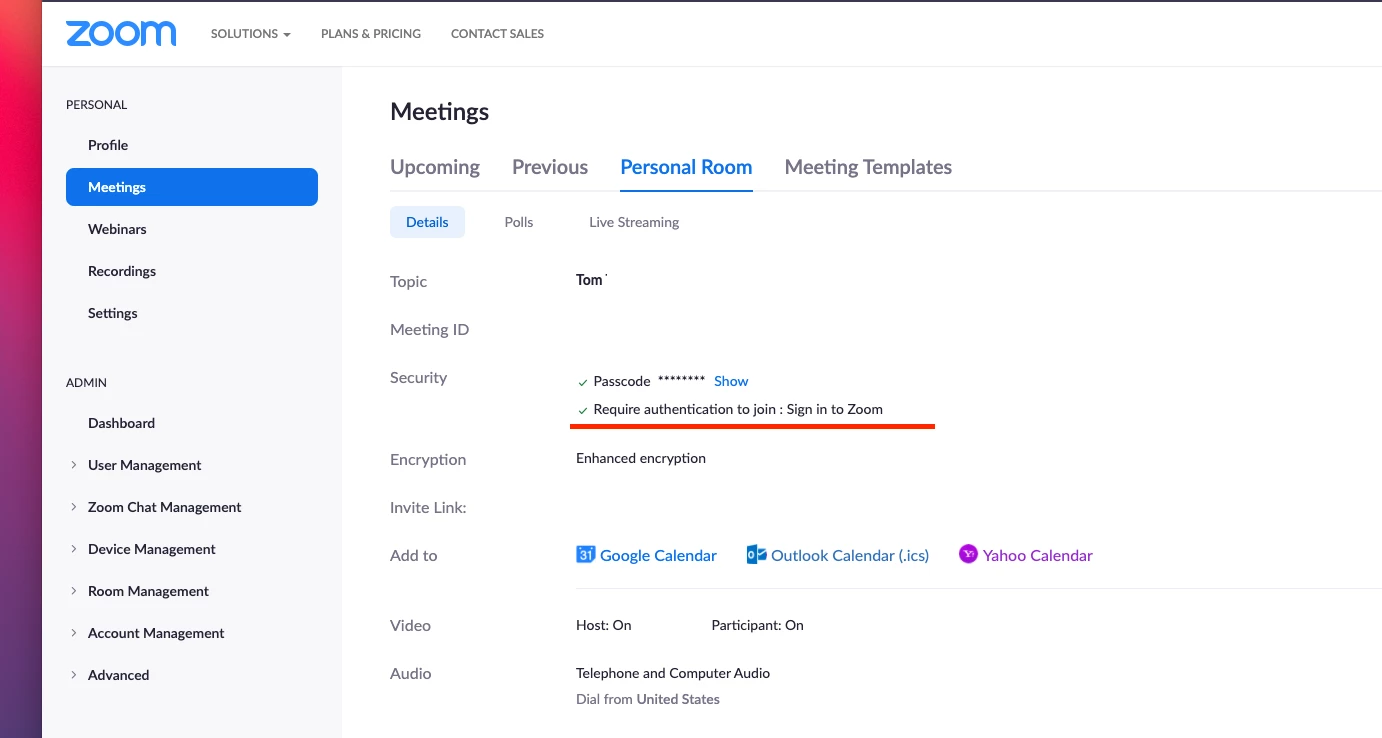 In my settings, it says it is off. But when in a zoom meeting it says its enabled. Any participant that wants to join a meeting has to authenticate before joining. I did not turn this function on and at some point it just started being permanently on regardless of what the "on / off" switch does in settings. Any ideas?