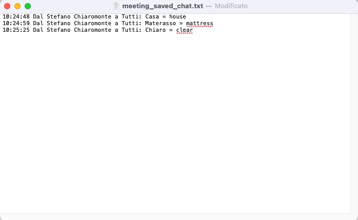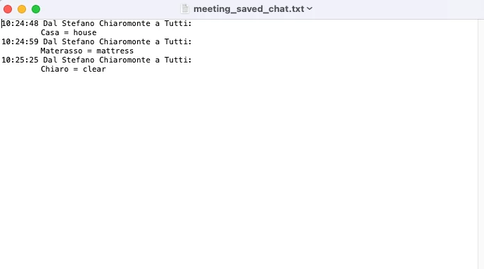 Hello everyone! I used to use Zoom on an old Mac and therefore I was using an old version. Now that I upgraded my Mac and using the latest version of Zoom I find saving zoom chats really frustrating. I am a language teacher and I use the Zoom chat during a meeting to write new words to my students. In the previous version of Zoom every time I saved the chat to then copy it and paste it on the Google doc I have with my students was very easy as the name of the sender (me in this case) would not get into the way. But now the Zoom chat when saved displays as in picture "new saved chats" and copying the single words has just become so frustrating! Is there a fix for that or another option I could use?