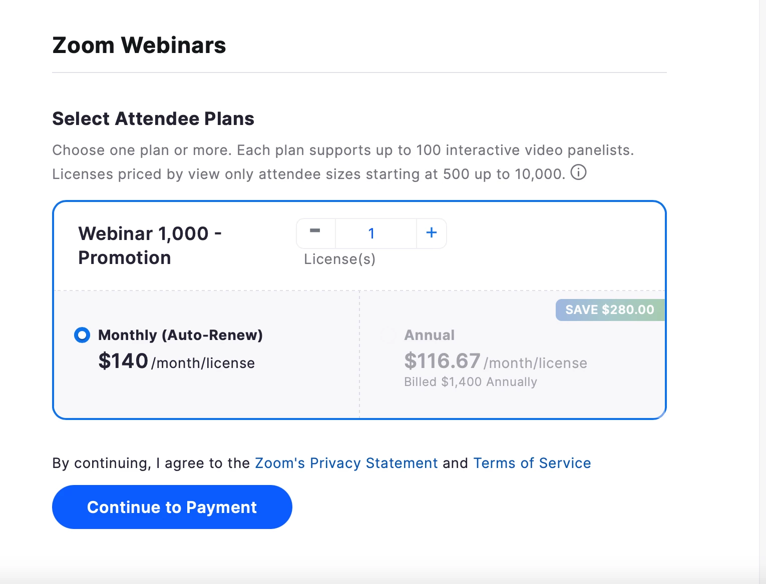 I currently have 1 Webinar License in my Zoom Pro account. When I go to add increase the Webinar license to "2" it will not let me increase it. The Plus sign does not activate the number to go up. I cannot purchase another license. Anyone know of a fix for this? See screenshot of the page I am having issues with.