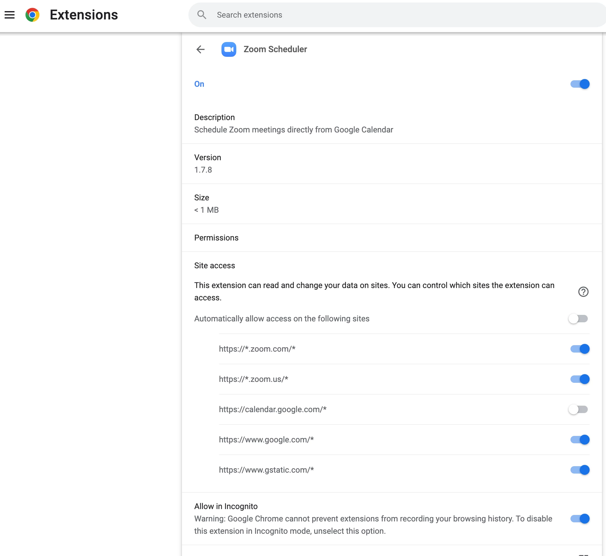 Enabled the Chrome Zoom APP - now my Google calendar will not load. Goes into a mode where it is searching for "something". Accessing the settings for the Zoom APP - when I disable the link for Google calendars - the calendar loads, but no capability to setup a Zoom call.