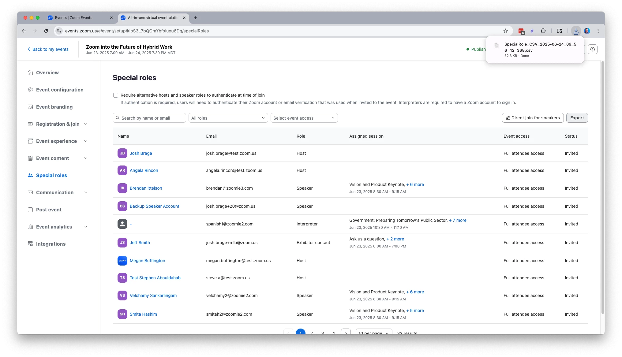 Is there a method to retrieve a Panelists email invite WITHOUT having it send the email? Most notably I would like to retrieve the unique passcodes and join links of each. This is for single session live webinar in Zoom events. I am used to the regular Zoom Webinar setup where when you add a panelist, you could retrieve their unique join links and passcodes by "Copying Invite" in the panelist area, or by exporting the panelist list (which i see is no longer an option either). For the way In utilize Zoom Events/Webinar, emails cannot be sent out to the panelists, and I had this setting turned off in Zoom Webinar.