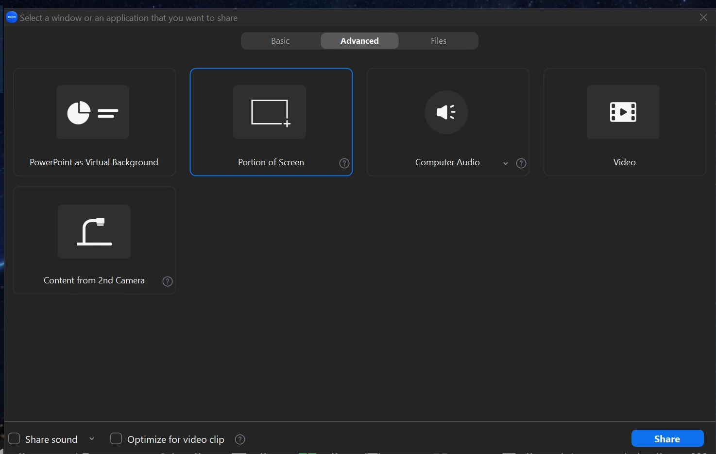If you want to try out the potential extended screen option, you can start a meeting, then Share Screen, choose Advanced at the top, and then Portion of Screen, Then you can drag the edges to take up both of your monitors.