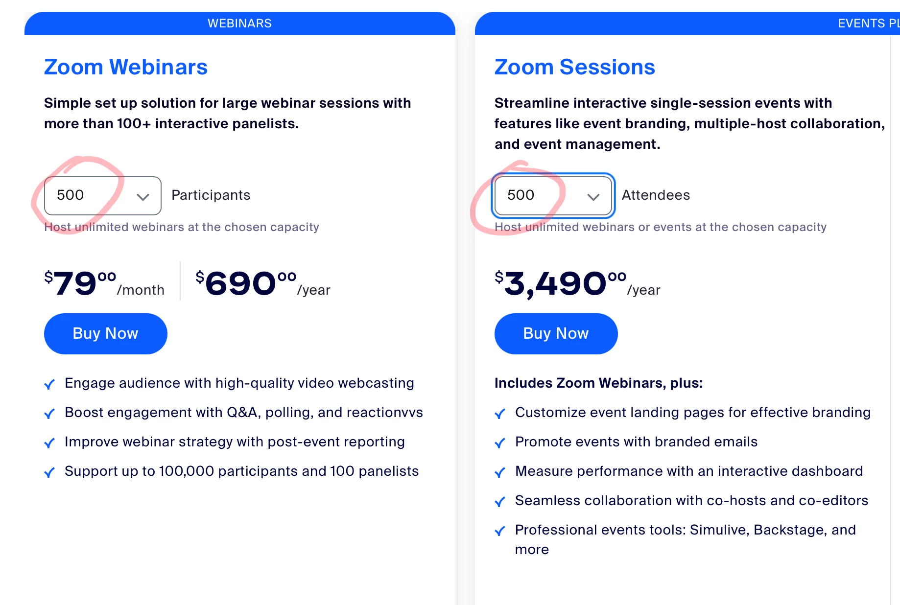- An annual “Unlimited” license which, like the classic Webinar license, allows you to have as many (non-concurrent) Webinar-format sessions. There are a number of benefits to this license type, but is much more expensive at the 500 attendee level: