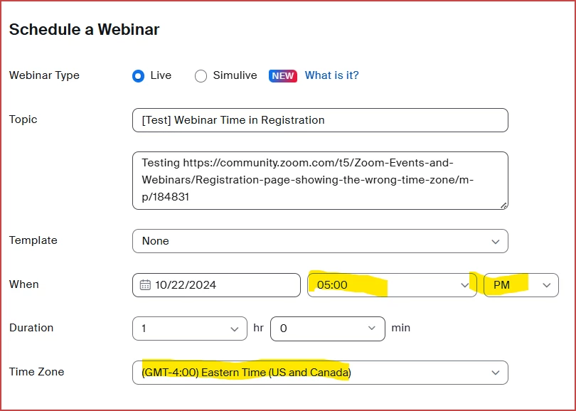 I have created a webinar and the registration page is showing the wrong time zone - I have changed all the settings to the correct time zone in the webinar settings and recreated the webinar a number of times however, the time zone on the registration page is still wrong - is there somewhere else in the settings I change this?