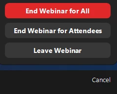 With Backstage enabled, after you have started the Webinar for Attendees and are winding down, the End button in the lower right gives you these options: