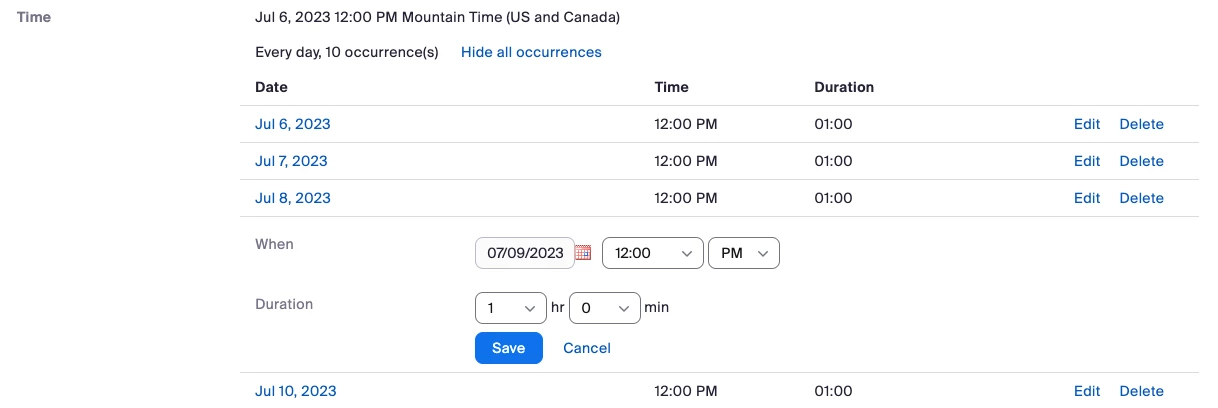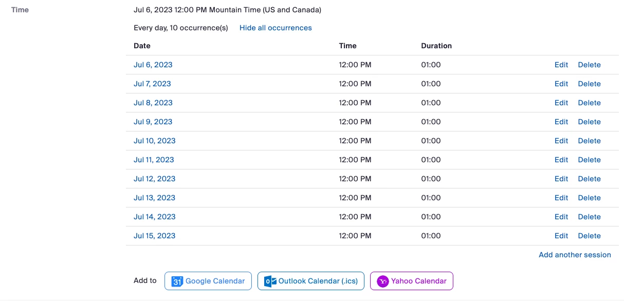 2. Is there a way to bundle a group of classes together that doesn't follow the allowed options of daily, weekly, mothly etc? We have a course that is five sessions long over two and a half weeks. Example: Monday/Thurday/Monday/Thursday/Monday. Sending 5 individual links is time consuming and confusing. Is there a way to send one link that would cover all of these sessions? If so could you please send instructions?
