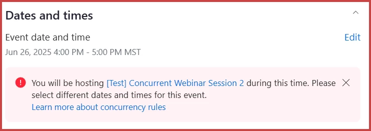 So bottom line is no, you can't schedule concurrent stand-alone webinars on Zoom.US, and you can't schedule concurrent single-session webinars on a Subscription Zoom Events or Zoom Sessions license.