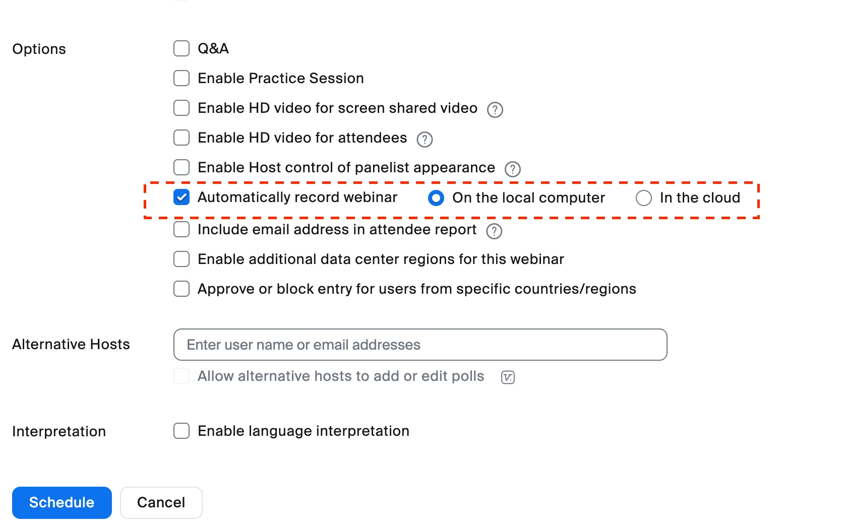 I cannot figure out how to enable the recording feature on the zoom webinar when I set up an event.