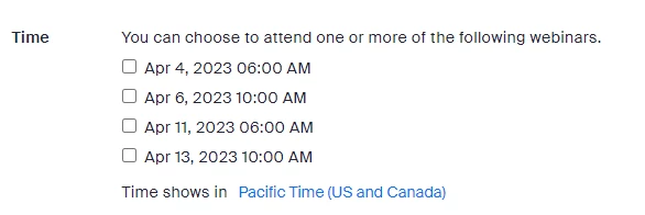 I'm putting together a webinar where attendees will be joining from across the globe. To make the registration page accessible, I want registrants to be able to select their local time zone - with the webinar times updating automatically to reflect the time zone that they have selected. This feature is automatically included in the registration page, but I'm wondering if it's possible to customize any of the text or layout related to selecting the time zone. Please see the attached screenshot for reference, which displays the current layout, automatically generated by Zoom.
