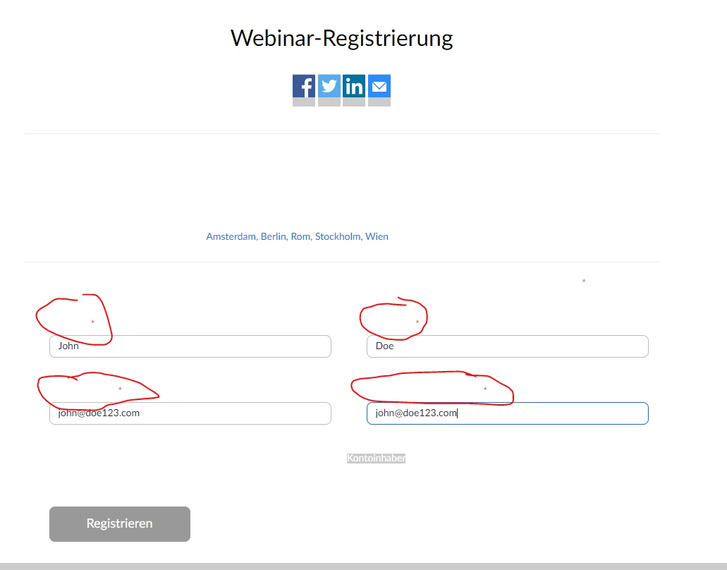 I have set up a webinar with mandatory registration. Unfortunately, the registration page looks buggy (see attached screenshot). It looks like the labels for first name, last name and email adress are white-colored on a white background, so they are invisible. Happens with different browsers (Chrome 102.0.5005.63, Firefox 101.0.1) and from different networks. Is there anything I can do?