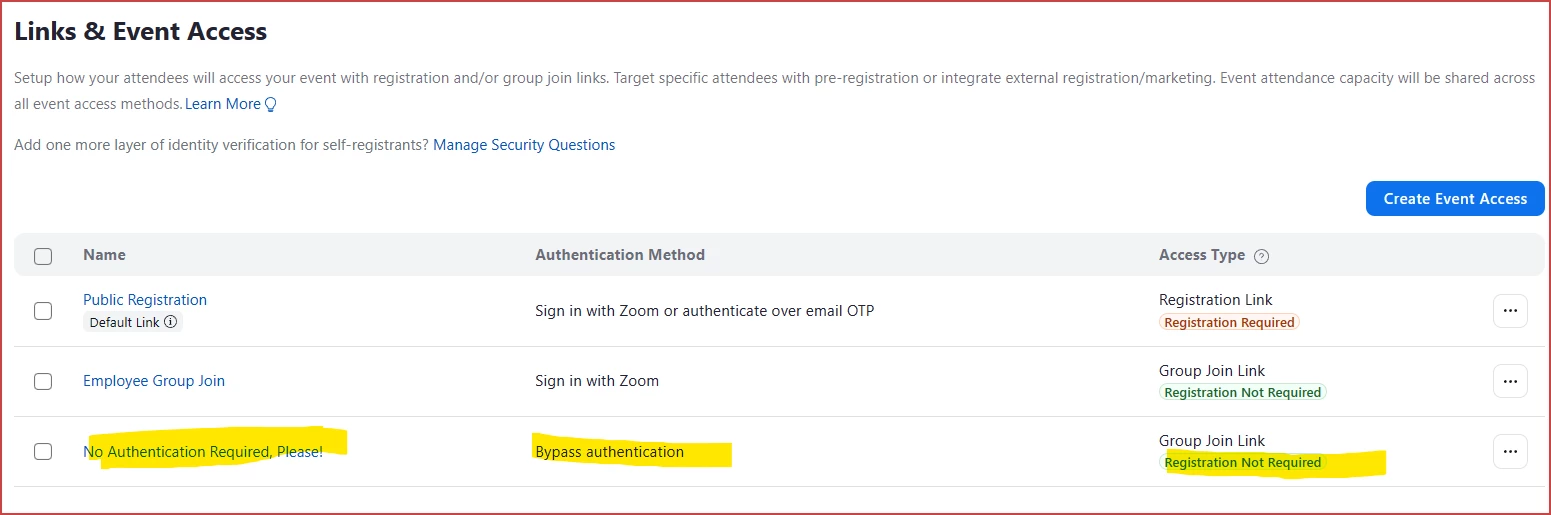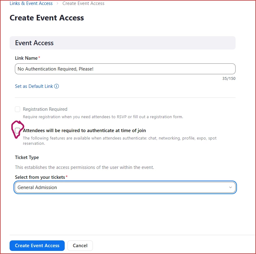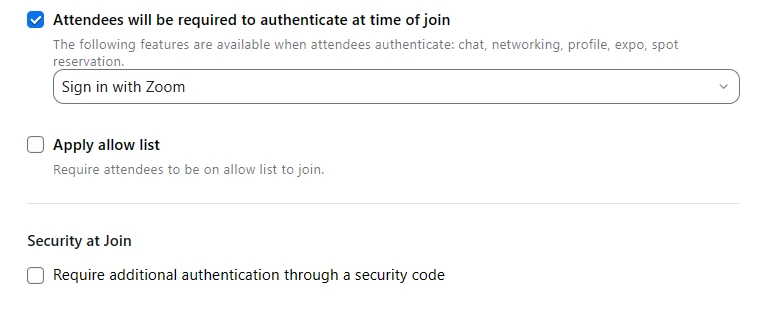 Zoom Events - turn off authentication