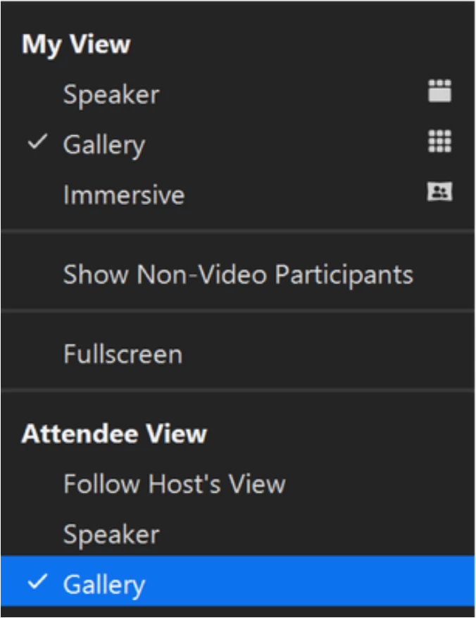 - Speaker: Speaker view switches between the active speakers in the webinar, with other video panelists above the active speaker when not speaking.