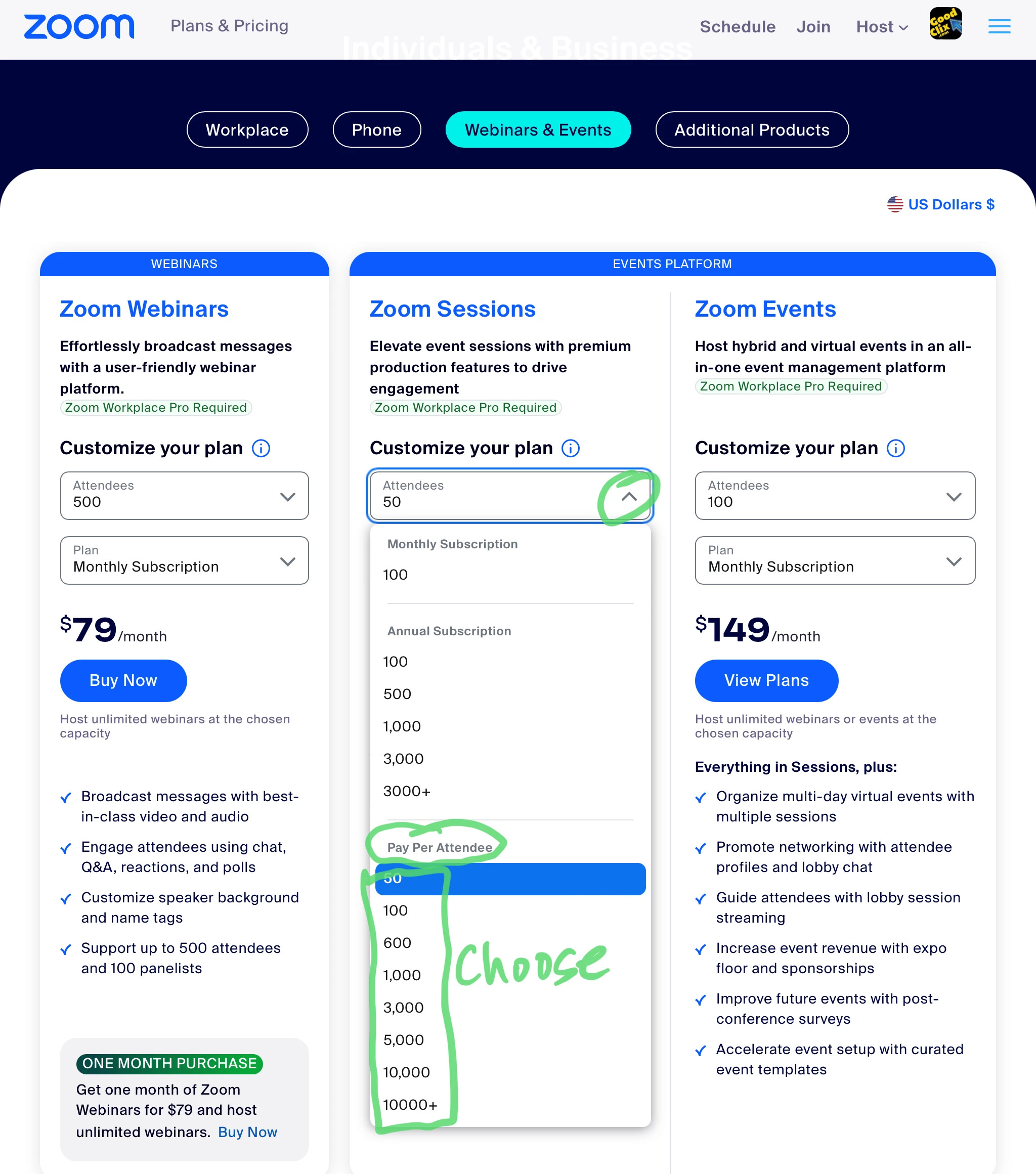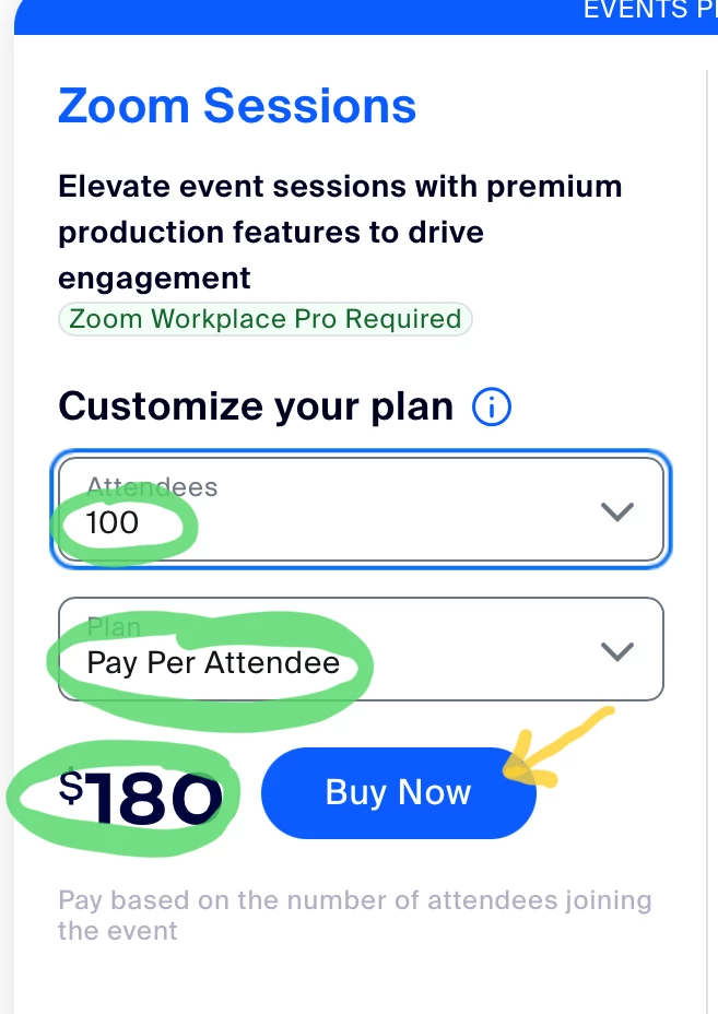 If you are buying your licenses on the Zoom Events Pricing page, these are the only options you have. If you go through your Zoom Account Exec or through a Zoom Partner Reseller (like me!), you can specify exactly how many seats you want at the time of purchase. If you wanted to buy 350 seats, you would pay the per-seat price of the next lower level (100 seats at $180 = $1.80 per seat) times the number of seats you want (350 x $1.80 = $630). If you wanted another 75 seats, that price would be based on the per-seat price of 50 (it's a new purchase transaction), not based on the price of the last purchase you made.