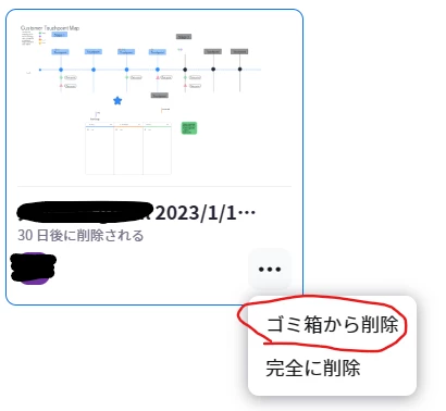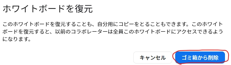 ホワイトボードを誤って削除してしまい、復元したいのですが、削除リストから選択し、…ボタンをひらいても復元ボタンがありません。どうしたら復元できますか?