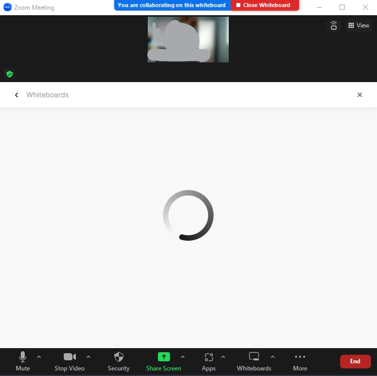 I am not able to join Whiteboards when in a meeting anymore, even my own Whiteboards: a white screen with a spinner appears, and the Whiteboard never appears (see screenshot below).