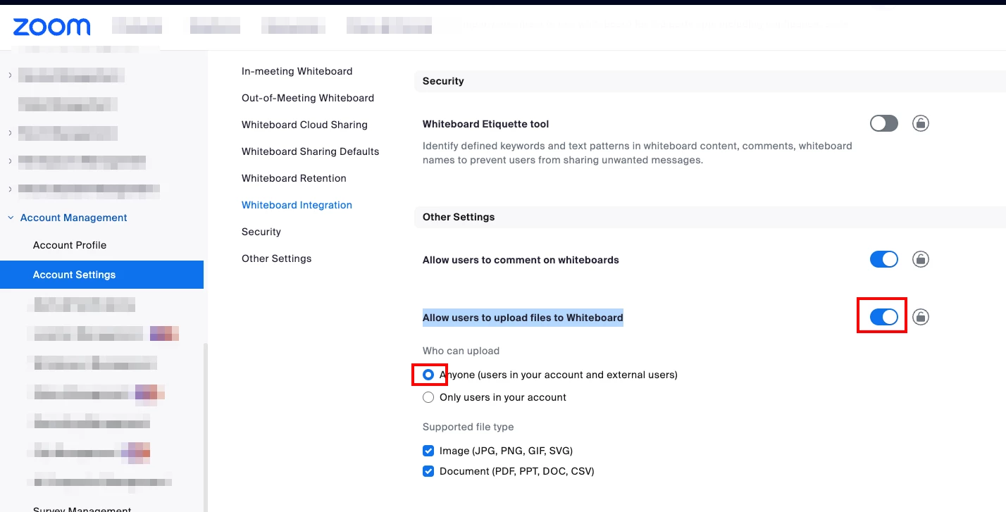 I ran two Zoom meetings with whiteboard yesterday. In the first, my meeting guests (not part of my organization, they just got to the meeting via my Zoom link) could see the 'upload' tool in the tool panel.