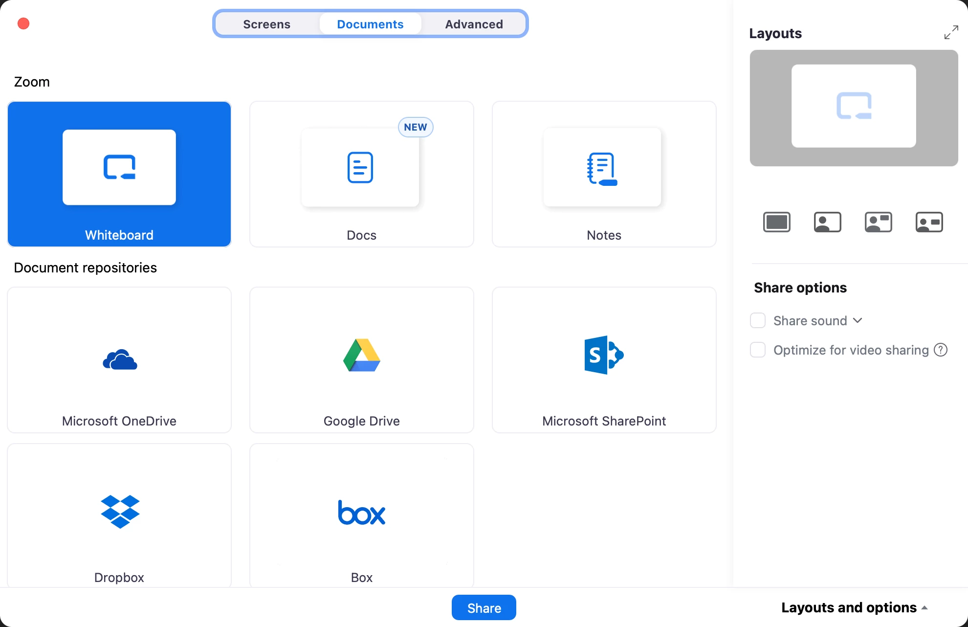 When sharing screen it does not give me the option to choose whiteboard or screen, only the files that I have open
