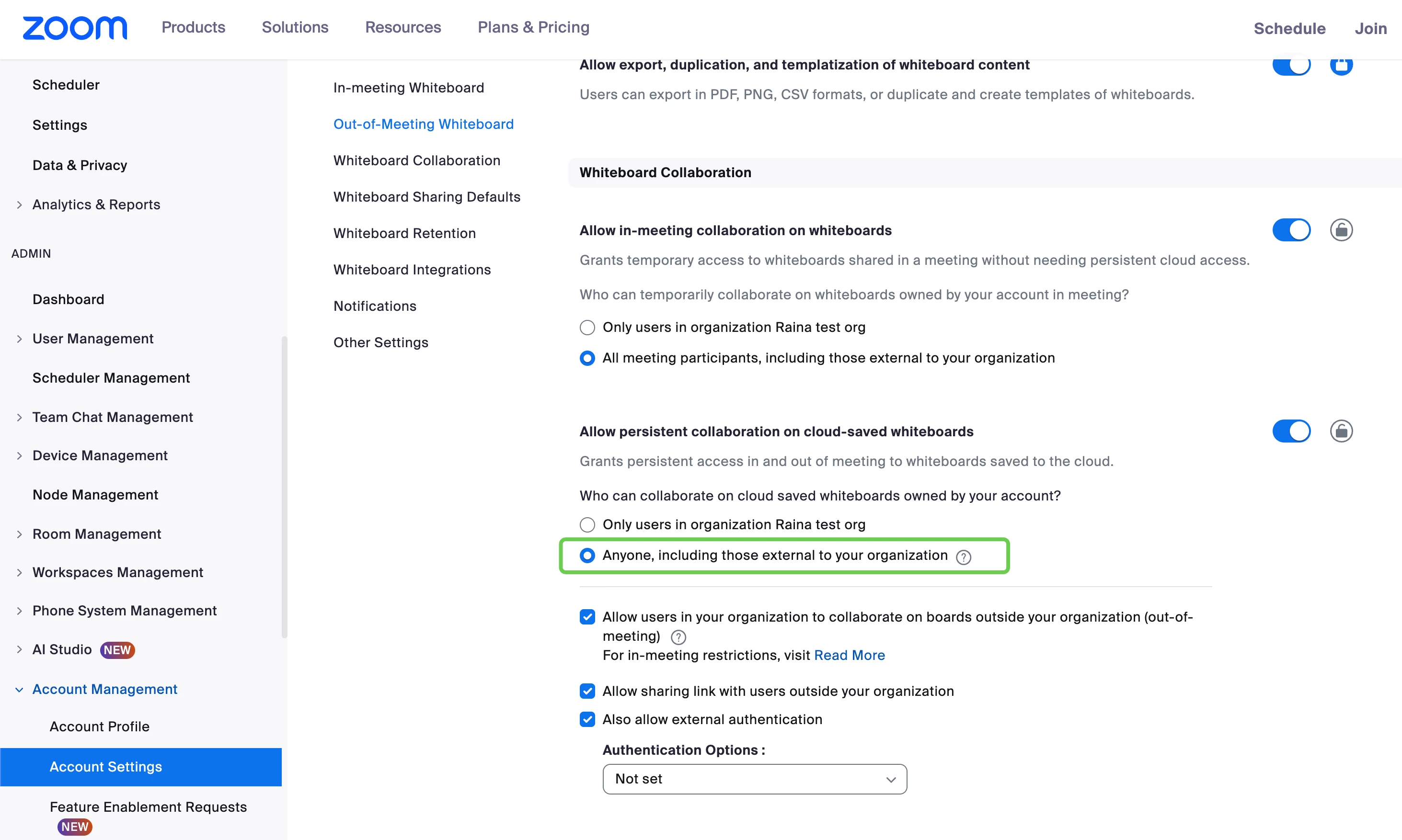 I am a member of a company (which I will call "Company A") and months ago shared a whiteboard with several Zoom users outside my company, including someone in what I'll call "Company B." Now for some reason it appears that my ability to share new whiteboards is restricted to people within Company B.