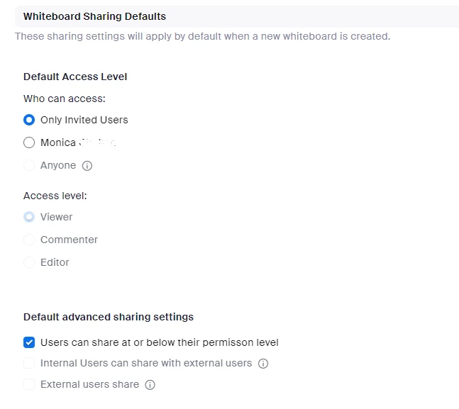 We tried to have a meeting in which we shared links to multiple whiteboards we created, thinking their group could access their own personal whiteboard while discussing over zoom. We were blocked from sending them to users outside of our "organization". How do we turn this off, so we can share them with external people? The buttons inside the whiteboard were greyed out.
