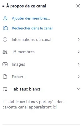 In our channel, we see in the info panel an item "whiteboard", which indicates that the shared whiteboard would appear here (cf. attached file).