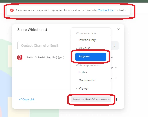 In Whiteboard, whether viewing from Web, the Zoom client, or in-meeting, when we attempt to set sharing/editor rights to "Anyone", it pops up with the message "A server error occurred. Try again later or if error persists Contact Us for help." The Contact Us link does nothing.