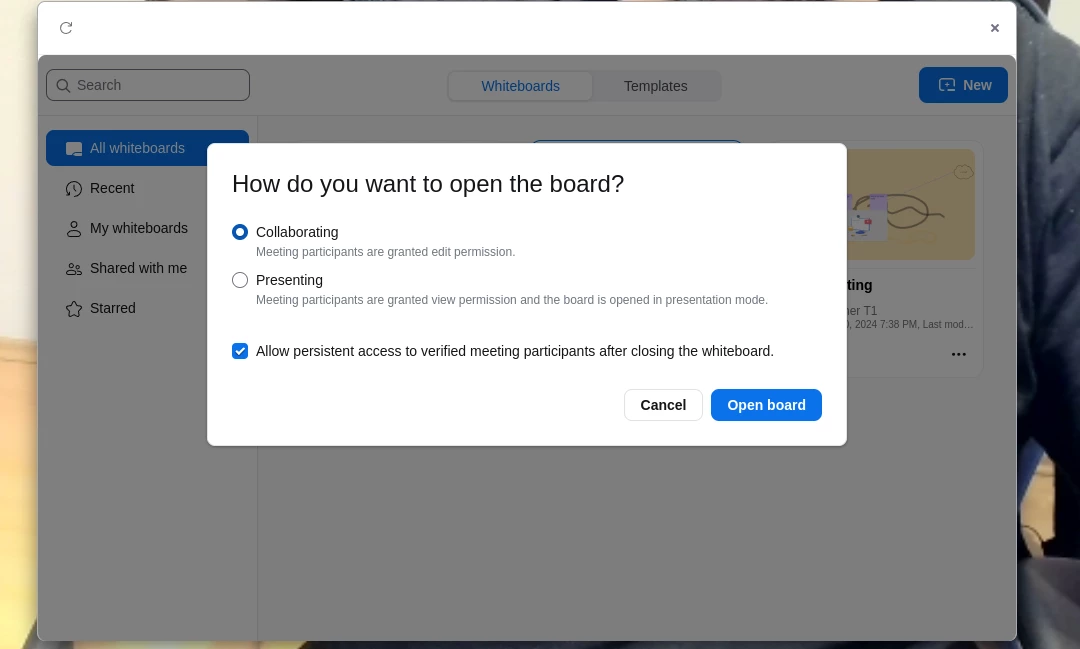 When opening a whiteboard inside a meeting, I get the option of Collaborating Mode and Presenting Mode. This works great. However, I cannot find a way to switch between modes once the whiteboard is already open. Is this possible to do? Or is the only way to exit the whiteboard and open it again in Presenting mode or vice-versa?