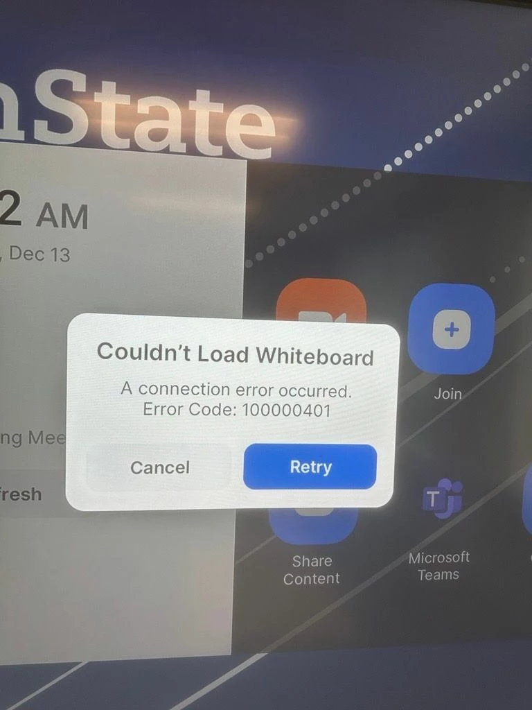 Hello, I'm trying to open the Zoom Room Whiteboard (New) for a Zoom Room Touch and I'm getting the error: "Couldn't Load Whiteboard - connections error code 100000401". See attached picture as well.